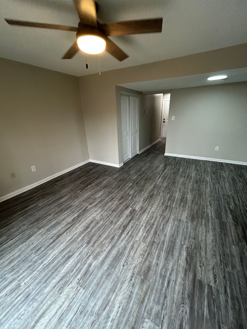 Recently upgraded 2-bedroom, 1.5-bath townhouse featuring luxury vinyl plank (LVP) flooring throughout. The home offers an open and functional layout with a family room, modern lighting, and ceiling fans in both bedrooms and the living room.